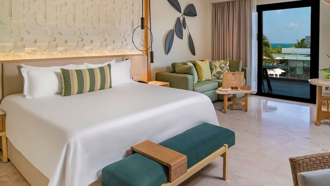 Settle into a spacious junior suite featuring a private furnished balcony with a whirlpool tub and glimpses of the Caribbean beyond lush tropical gardens. Premium linens, spa-style amenities, and contemporary Mexican design create an easy, relaxed vibe.